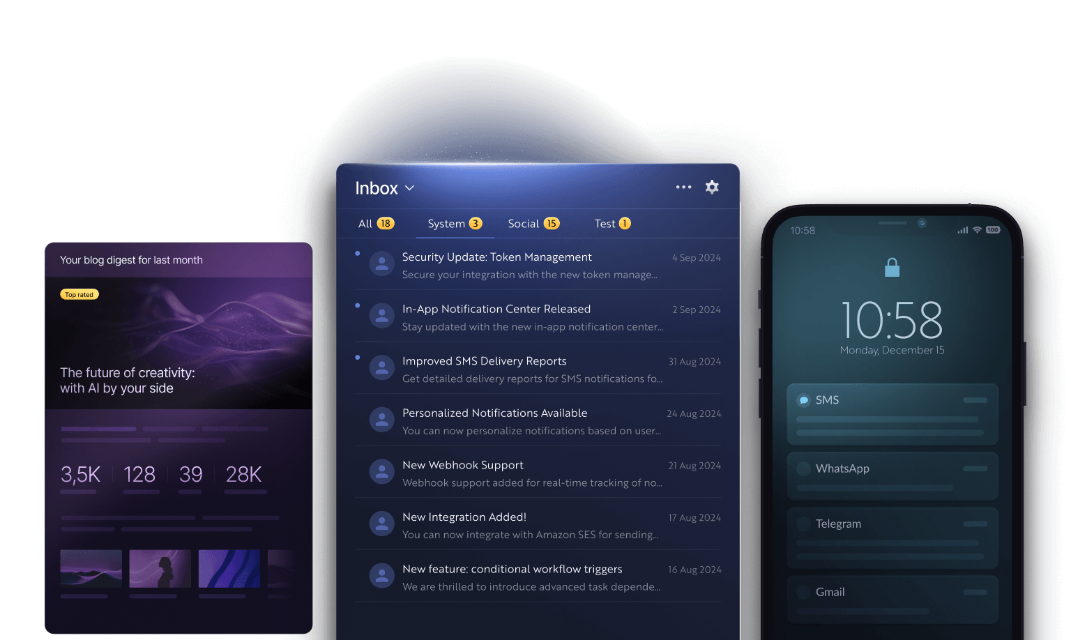 Install the SDK, drop in the Inbox component, and trigger notifications from your backend. Three steps to a complete notification system.